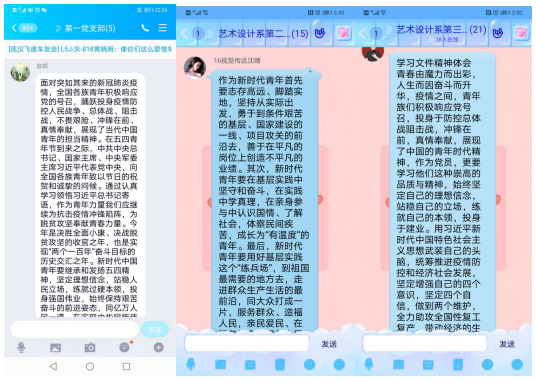 艺术设计系党总支围绕《习近平总书记在5月6日召开的中共中央政治局常务委员会会议上的讲话精神》、《习近平总书记在4月29日召开的中共中央政治局常务委员会会议上的讲话精神》、《习近平总书记在五四青年节对广大青年的寄语》和《学校2020年党风廉政建设工作会议精神》等文件,组织各支部利用线下自学和线上交流的方式开展了学习。