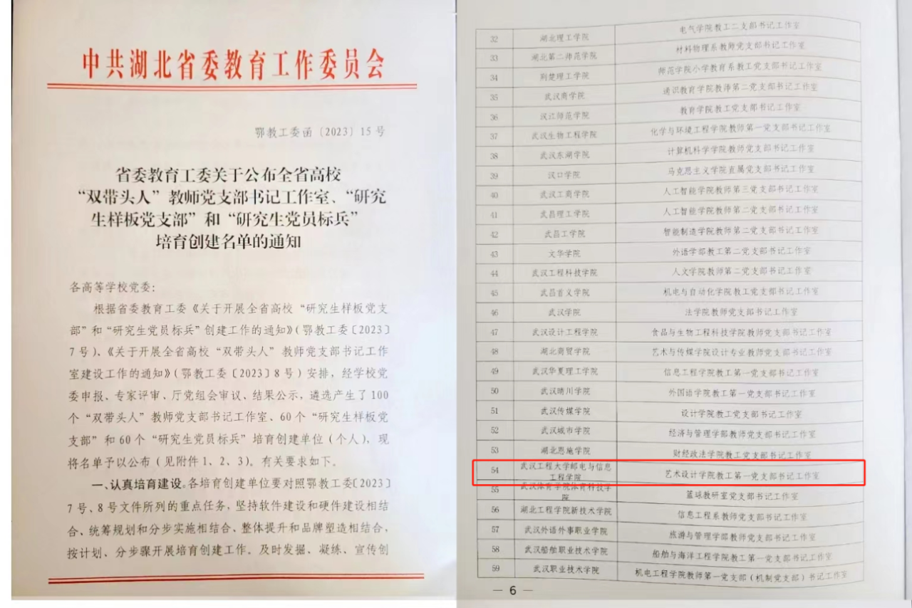 近日,省委教育工委印发《关于公布全省高校“双带头人”教师党支部书记工作室、“研究生样板党支部”和“研究生党员标兵”培育创建名单的通知》,我院yL23411永利教工第一党支部书记工作室成功入选全省高校“双带头人”教师党支部书记工作室培育创建单位。这是继我院机械与电气工程学院党总支入选湖北省高校党建工作标杆院系培育创建单位后,学院党建工作取得的又一项重要成果。