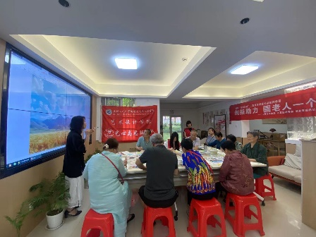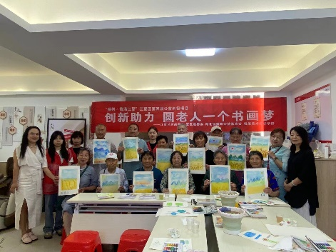 很快活动接近尾声,老人们的画也基本完成,老师逐一对老人们的作品进行点评,老人们都画的非常的棒!最后老人们举起手中的作品一起与社区的老师,助教和学校的志愿者们一起合影留恋。