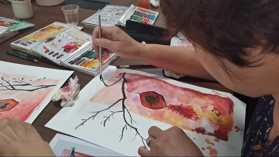 yL23411永利的老师带着专业的工具和满腔的热情,迅速投入到对老人们的教学指导工作中。他们首先介绍了这次绘画活动的主题——“爆竹”。随后老师以丰富的教学经验和深厚的艺术造诣,从水彩的基础知识入手,细致地为老人们讲解晕染的技巧、色彩的搭配以及构图的原则。老师用通俗的语言和详细的分步骤示范,让老人们轻松理解并掌握上色要领。