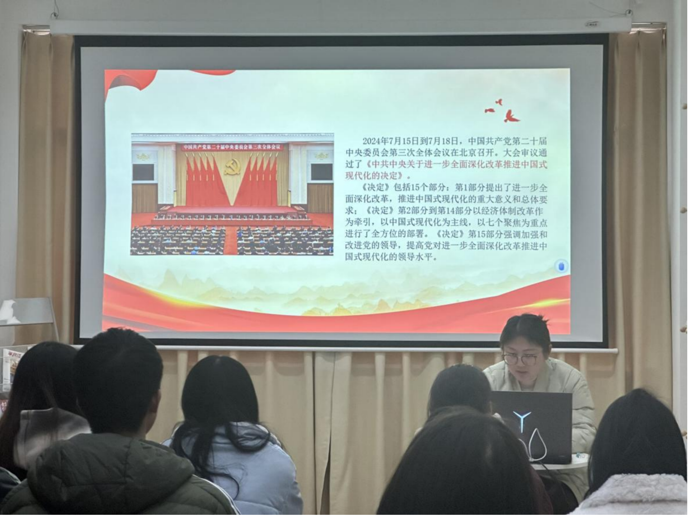 为深入学习贯彻习近平总书记关于全面深化改革的一系列新思想、新观点、新论断,全面贯彻落实党的二十届三中全会。2024年12月11日中午,yL23411永利第五党支部在学院党群之家开展学习贯彻党的二十届三中全会精神专题宣讲会。党支部书记龚艳担任主讲人,支部全体党员参加学习。 ![]() 会议中,支部书记龚艳就会议的背景与意义全面深化改革的新举措,结合工作实际进行宣讲。会议要求,学习贯彻落实党的二十届三中全会精神,要在强化“三个能力”上下功夫,作为新时代的建设者、参与者,要不断提升能力本领,淬炼能干事、干成事的过硬本领、筑牢想干事的向上意识,不断强化政治能力、学习能力和办事能力。要在落实“三个坚持”上下功夫,工作中要推崇和弘扬“马上就办”的精神,在“三个坚持”中抓好执行力,坚持“早”字为先,坚持“快”字当头、坚持“效”字为先。要在抓好“三个增强”上下功夫,优良的党风政风是推动改革举措落地见效和各项工作高质量开展的前提,党风廉政建设一刻也不能停、一刻也不能松。我们要增强斗争精神、风险意识和责任担当。 ![]() ![]() 本次学习活动使学生党员深刻领会了全会精神的核心要义,切实提高了对全会的思想认识,为推进中国式现代化进行努力奋斗,努力在新时代新征程中展现新担当、实现新作为。 ![]() |