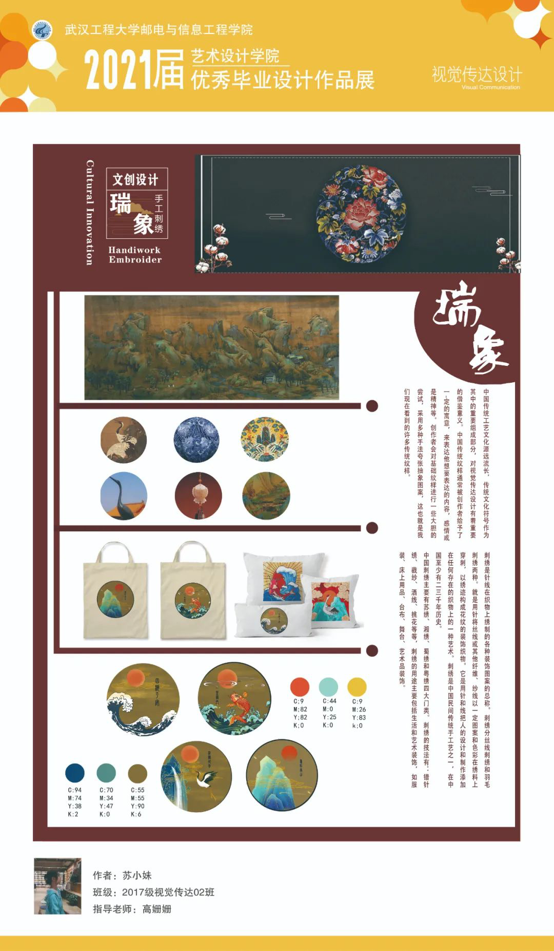 设计说明:手工刺绣指以手工的方式,用针和线把人的设计添加在任何存在的织物上的一种艺术,也是中国非物质文化遗产保护中最珍贵的物种之一。这次的设计把中国传统的吉祥纹案经过加工处理与再设计,再融入一些其他元素,经过扁平化的处理和使用了中国传统山水画常用的留白手法之后,运用手工刺绣的方式表现出来,表达了现代大学生在高度机械化的今天努力找到手工作业的乐趣,积极地继承中国传统文化,并以此为傲。