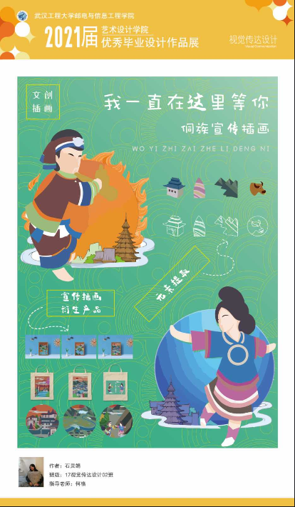 设计说明:一个女孩一直在想总有一个声音在呼唤她旅行,在来到皇都之后她认定这个声音来源于这里。从这个女孩的视觉角度来向大家展示皇都侗寨的文化特色和人文风情。以皇都侗寨文化特点为主题的《我一直在这里等你》扁平风格插画设计,不仅仅提供受众视觉上的愉悦,它更可被赋予其他的使命及意义。对皇都侗寨的旅游发展和传统民俗传承起到推动作用。