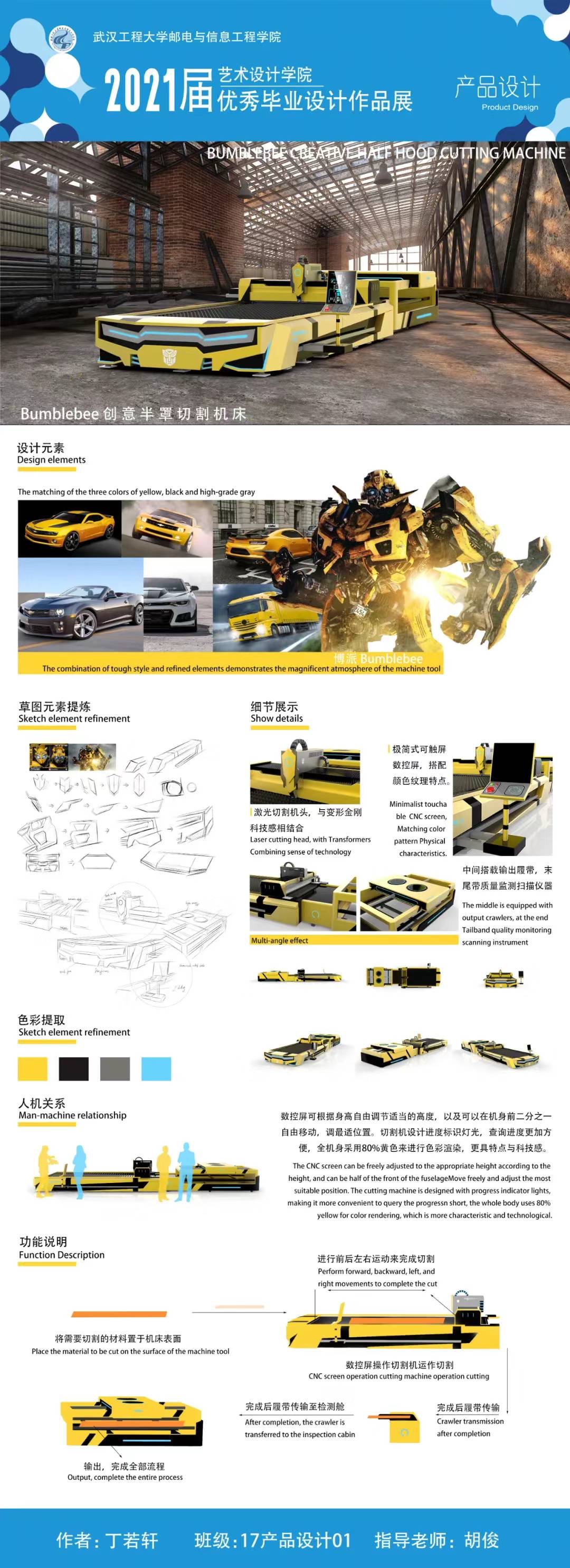 设计说明:Bumblebee创意半罩切割机床设计,整体造型采用变形金刚博派大黄蜂硬朗风格,颜色布局以黄与灰黑为主,更加复合大黄蜂色调。机床采用一体式输出,将需要切割的材料置于机床表面切割后,由中间履带传送至尾部检测舱,检测材料数据与完整性等参数。侧面的数控屏可在机身前二分之一自由移动,调节高度,以适应各种位置需求,整体更具特点与科技感。