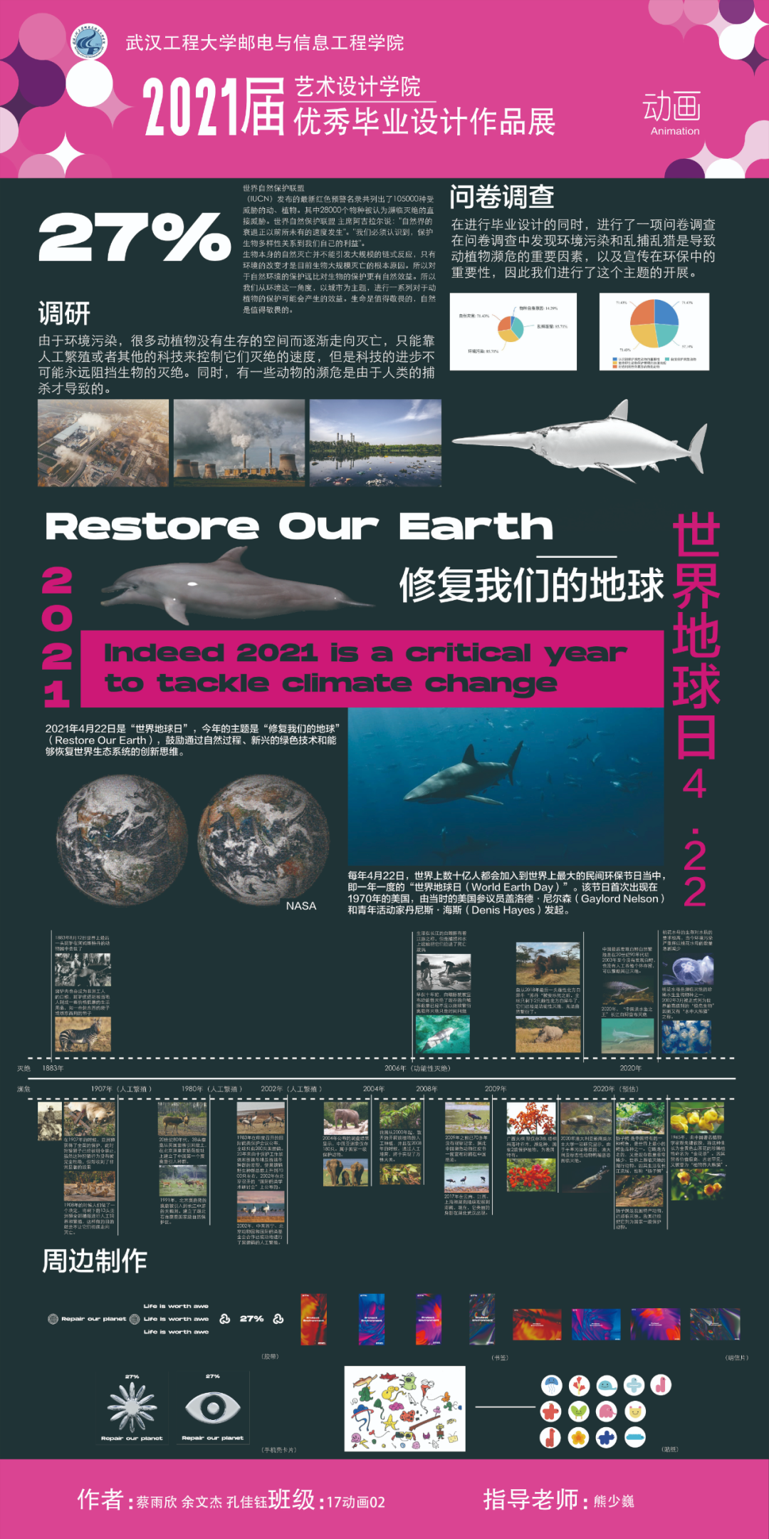 设计说明:随着社会的发展,自然界的生物正在逐渐减少,我们必须意识到保护生物多样性的重要性,生物本身的灭亡并不能引起大规模的链式反应,只有环境的改变才是目前大规模生物灭亡的根本原因。所以我们从保护环境这一角度,以模型为基础,让大家意识到这些生物的灭亡可能会导致只能在网络上看到这些生物的模型,而不能真实的感受到它们的存在。