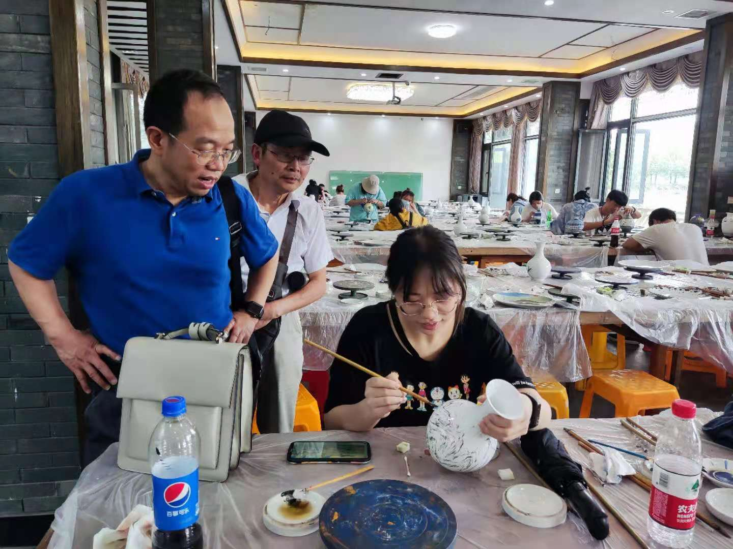 督导中心刘少文教授、胡安平督导14号中午到访基地后,随堂检查了正在陶艺基地进行釉上彩训练的2021级动画1、2班共计52名同学,与正在认真练习中的同学进行了深入的交谈。