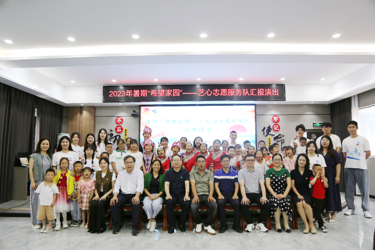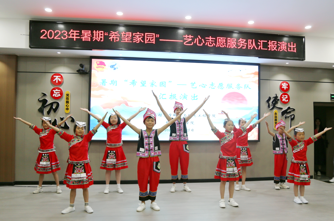 为了全面展示实践活动成果,丰富小朋友的文化生活,7月25日上午,艺心志愿服务队在野花坪村野花谷举办了暑期“希望家园”社会实践活动成果汇报演出。绿葱坡镇妇联副主席谭丽,野花坪村党支部书记王祖华,学院领导以及2023年暑期领导干部素质能力提升培训班全体学员参加本次活动。活动分为“美美与共”民俗风情展和志愿服务汇报演出两个部分。民俗风情展从风景、服饰、印染、图案四个方面展示了恩施土苗民族文化的特色。文艺汇演将志愿者支教期间授课的内容和生活点滴以舞蹈、情景剧、诗歌朗诵、视频等形式进行呈现。整场演出气氛热烈、精彩纷呈,展示了艺术师生将专业融入支教,传承弘扬文化,用奉献书写成长,笃行成就梦想的青春风采。