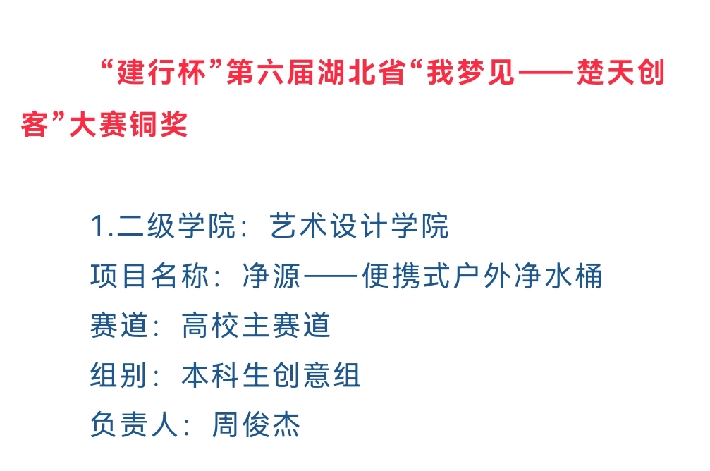 同时,在“建行杯”第六届湖北省“我梦见—楚天创客”大赛中,喜获省级铜奖1项。