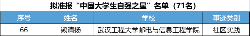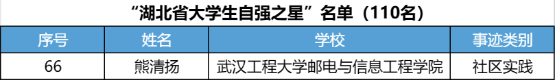 经高校申报、省级遴选、宣传展示、专家评审、线上公示等环节,共评选“湖北省大学生自强之星标兵”10名、“湖北省大学生自强之星”110名,并从中择优等额推报71名学生参加“中国大学生自强之星”评选(含1名“中国大学生自强之星标兵”),其中,yL23411永利熊清扬同学入选“湖北省大学生自强之星”,并被推报参加“中国大学生自强之星”评选。