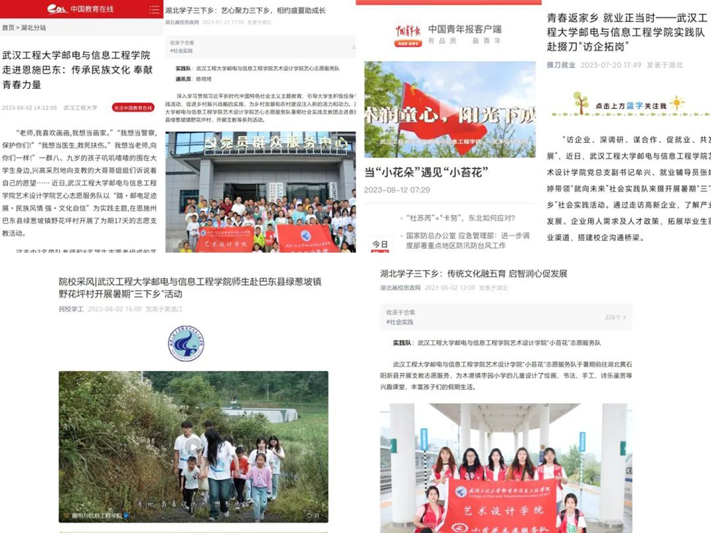各实践团队成员在实践中受教育,在磨砺中增才干,在服务中做贡献,不忘初心,牢记使命。活动受到了中国青年报客户端、中国教育在线、湖北高校思政网等主流媒体报道。