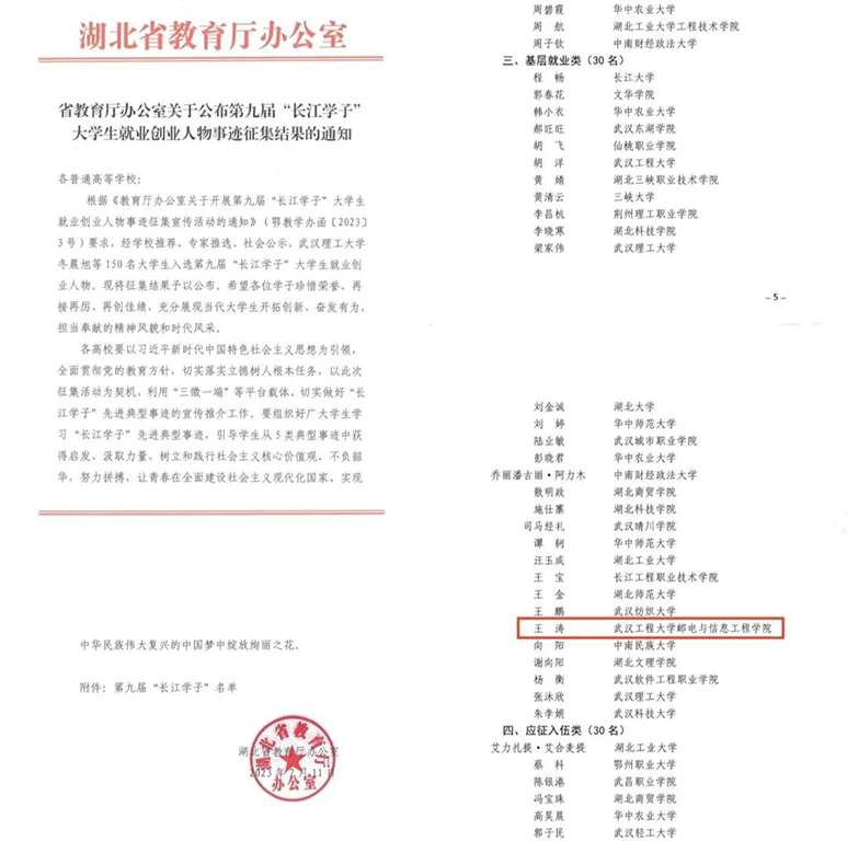 ![]() 校友,邮电之光! 2023年7月,湖北省教育厅公布湖北省第九届“长江学子”大学生就业创业人物评选的结果,经个人申报、学校审核推荐、专家评议,yL23411永利2018届动画专业校友王涛入选“基层就业类”人物。 ![]() ![]()