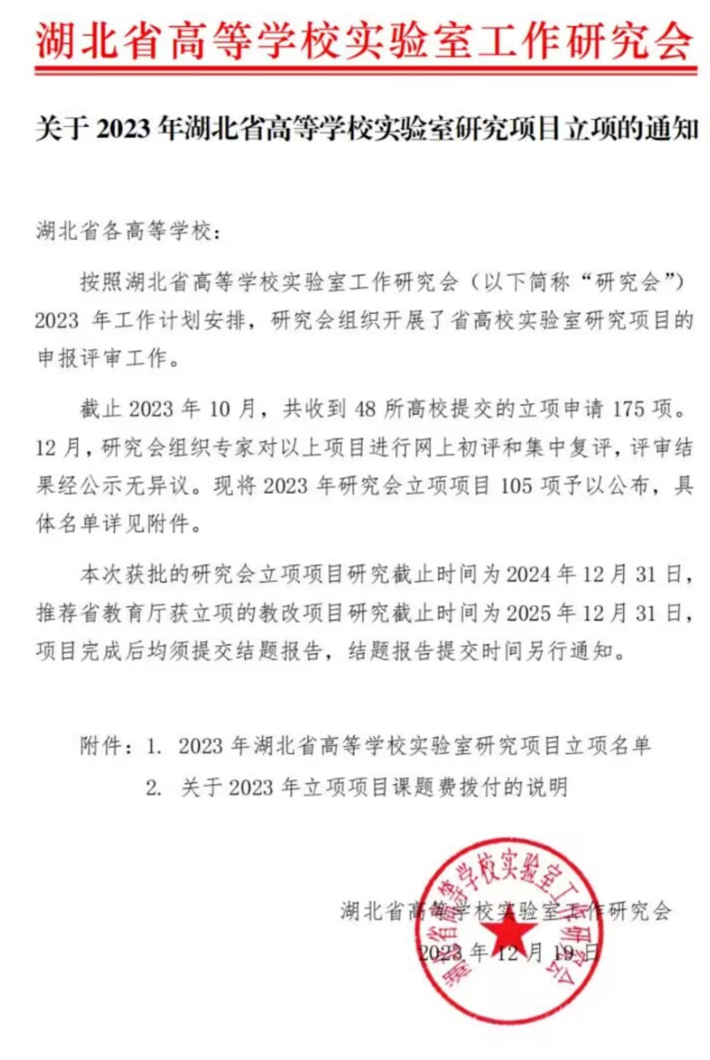 学院自教务部发布此项目以来,鼓舞和调动相关实验工作人员热情,为申报人员主动参与实验室建设和改革发展提供了新的渠道和平台。此次全省共有32所高校推荐的108个项目申请湖北省高等学校实验室研究项目立项,经网上初评、集中复评和评审结果公示,共有69个项目批准立项,包括A类项目18个,B类项目45个,C类项目6个。