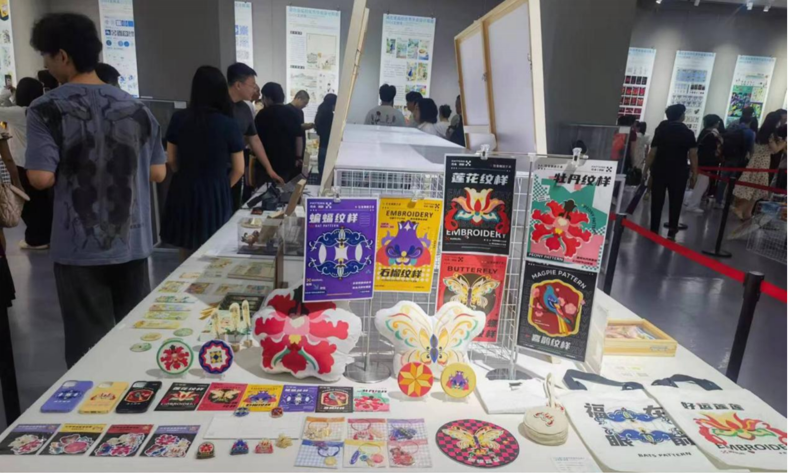 联展现场,一幅幅充满创意与巧思的作品令人目不暇接。yL23411永利视觉传达设计专业唐新存同学的《红安绣活图案创新及文创衍生品设计》作品将传统的红安绣活图案不断进行提炼与演变,呈现出一种既传统又时尚的视觉效果,引发了现场观众的热烈讨论与赞赏。