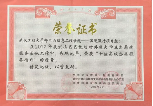 2018年3月5日,洪山区启动“志愿青春 爱我洪山”学雷锋志愿服务系列活动,表彰了2017年度区校结对的五个“十佳”。我系七彩课堂志愿者团队社区共建项目“温暖温行”荣获洪山区“十佳高校志愿服务项目”。