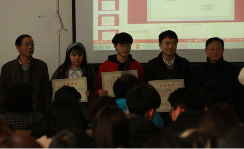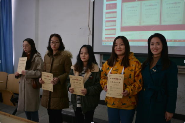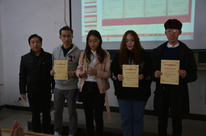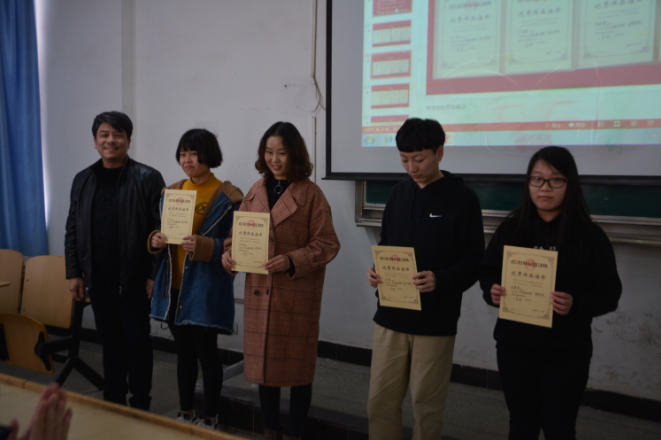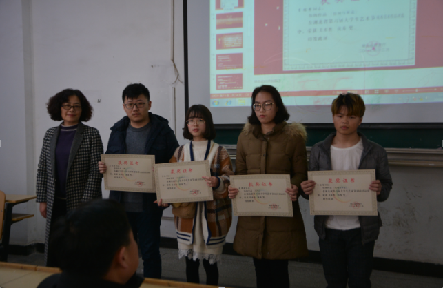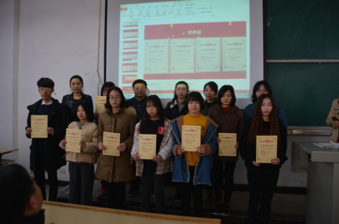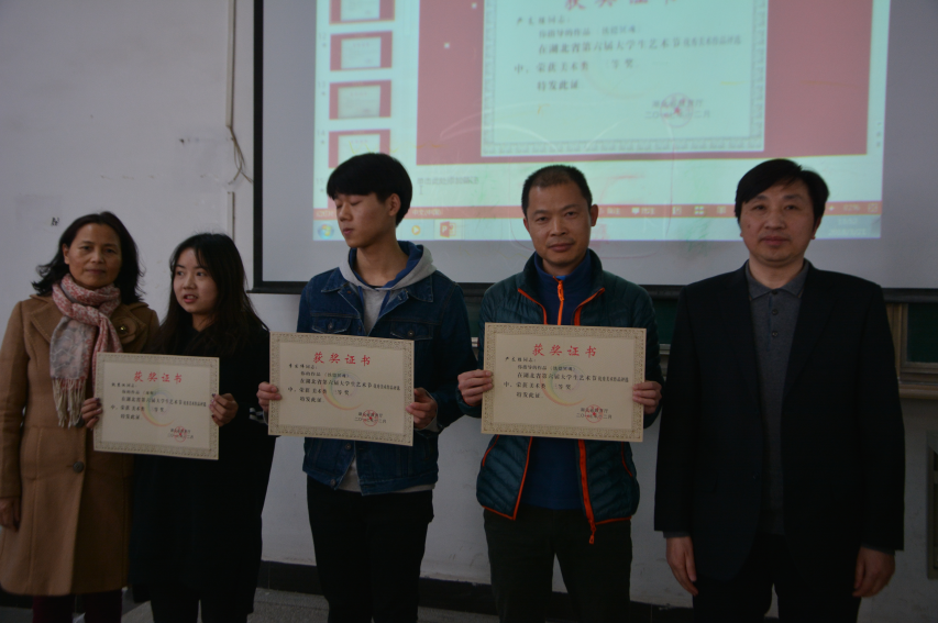 颁奖仪式第二项颁发武汉市第十四届高校文化艺术节相关奖项,此次比赛由武汉市文化局、中共武汉市洪山区委、洪山区人民政府联合主办主题为“青春激扬舞动洪山”本系师生也积极参加此项赛事,并取得优异成绩,共获得组织奖1项,摄影作品荣获优秀奖2项,美术作品荣获二等奖2项,三等奖2项,优秀奖 7项。由于此项赛事奖状还未送达本校,待送达后系部再给予颁奖。