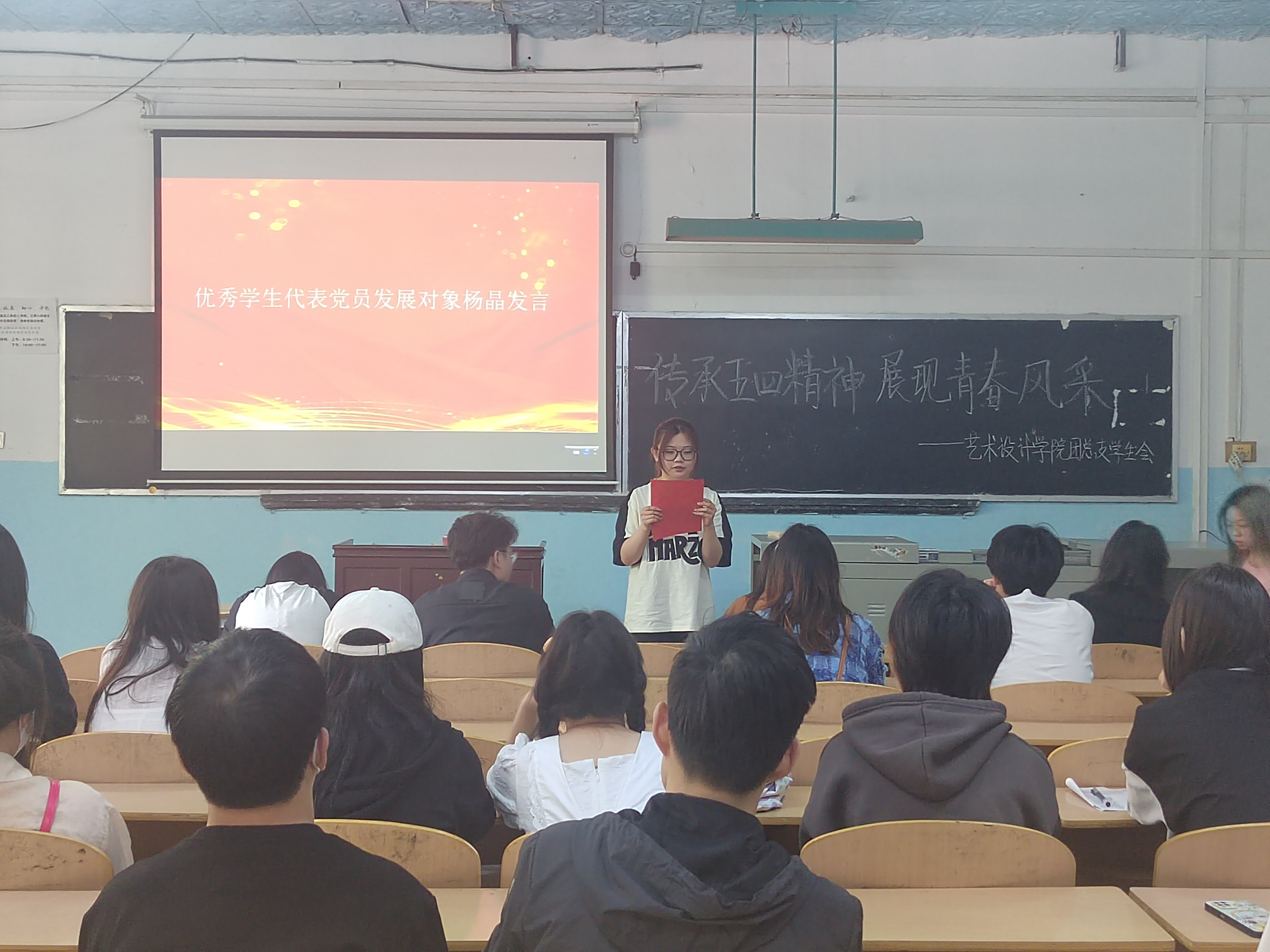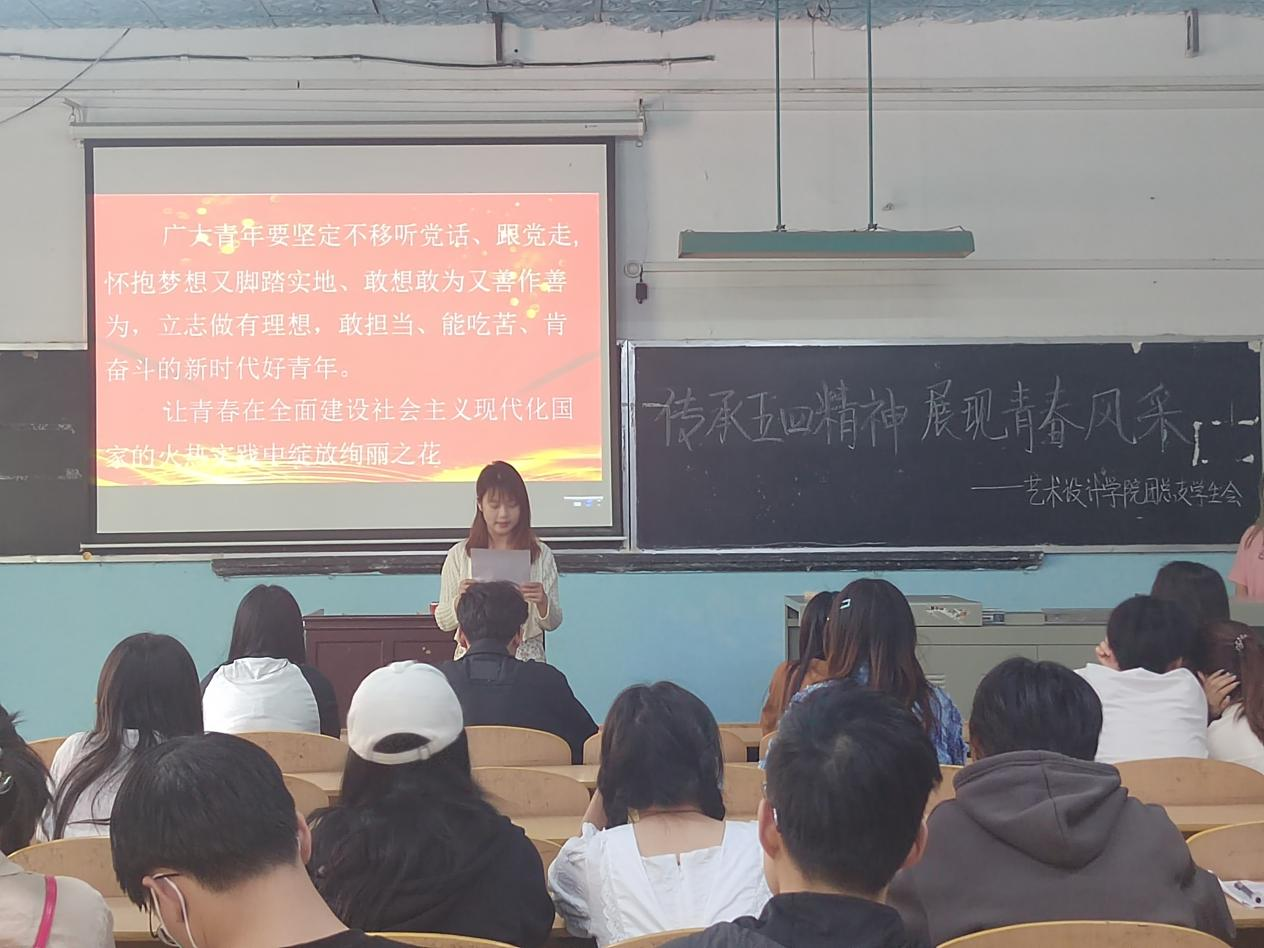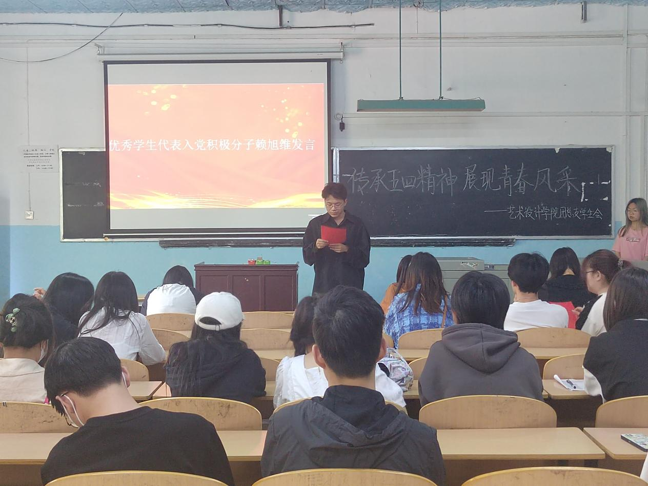 活动第二项,由优秀学生代表发言。作为学院发展对象——21环境设计01班杨晶说:今年的五四青年节,是党的二十大之后的第一个五四青年节,也是我担任团总支外联部部长的第一个青年节,相较于以往我更懂得了青年肩负的重任。习近平总书记的回信寄语启迪了我对团总支工作的更深层次的认知理解,开展活动要脚踏实地,关心青年学生的生活学习,维护青年学生的正当权益,及时准确地了解和反映青年的意见要求,配合好学院开展有益于青年身心健康的各项活动。同时我也会更加努力拼搏,用我的勇气和担当书写别样青春,用我的满腔热血和开拓创新为团学工作添亮增彩。