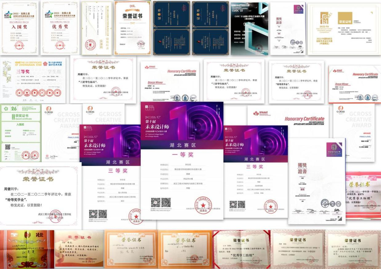 从专业的初探到深入研究,他立志以所学去探寻设计之美,为自己的设计创作注入独特的元素和风格。在大学三年间,他不断进步,成绩优异,专业排名始终位列第一,核心设计课多次获最高分,设计竞赛作品屡获殊荣。荣获本科生国家励志奖学金、特等奖学金、三好学生标兵、十佳社长等荣誉,累计校级及以上荣誉40余项;国际、国家级荣誉近6项,国家A类竞赛5项,申请受理实用新型专利2项。
