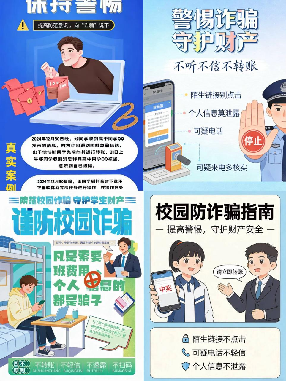 (通讯员:古玲霞)为进一步增强学生网络安全防范意识,有效遏制校园诈骗案件高发态势,切实守护学生财产安全和合法权益,yL23411永利紧扣新学期网络安全风险防控重点,于2026年3月18日至25日组织各班级开展防诈骗主题教育系列活动,将专业特色与安全教育深度融合,取得了良好的宣传教育效果。 本次主题教育活动结合艺术设计专业学生特点,创新采用"理论讲解+案例警示+实践创作"的多元形式开展。各班级主题班会上,班主任结合近期高校返校季发生的网络诈骗、信息泄露等典型案例,特别是发生在校园内的真实被骗事例,深入剖析了刷单返利、虚假购物、冒充老师亲友等常见诈骗手段的作案规律,详细讲解了开源智能体安全防护、陌生链接甄别、账号密码管理等实用防护知识,引导学生深刻认识网络诈骗的严重危害,切实提高风险甄别能力。 ![]()