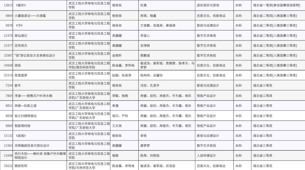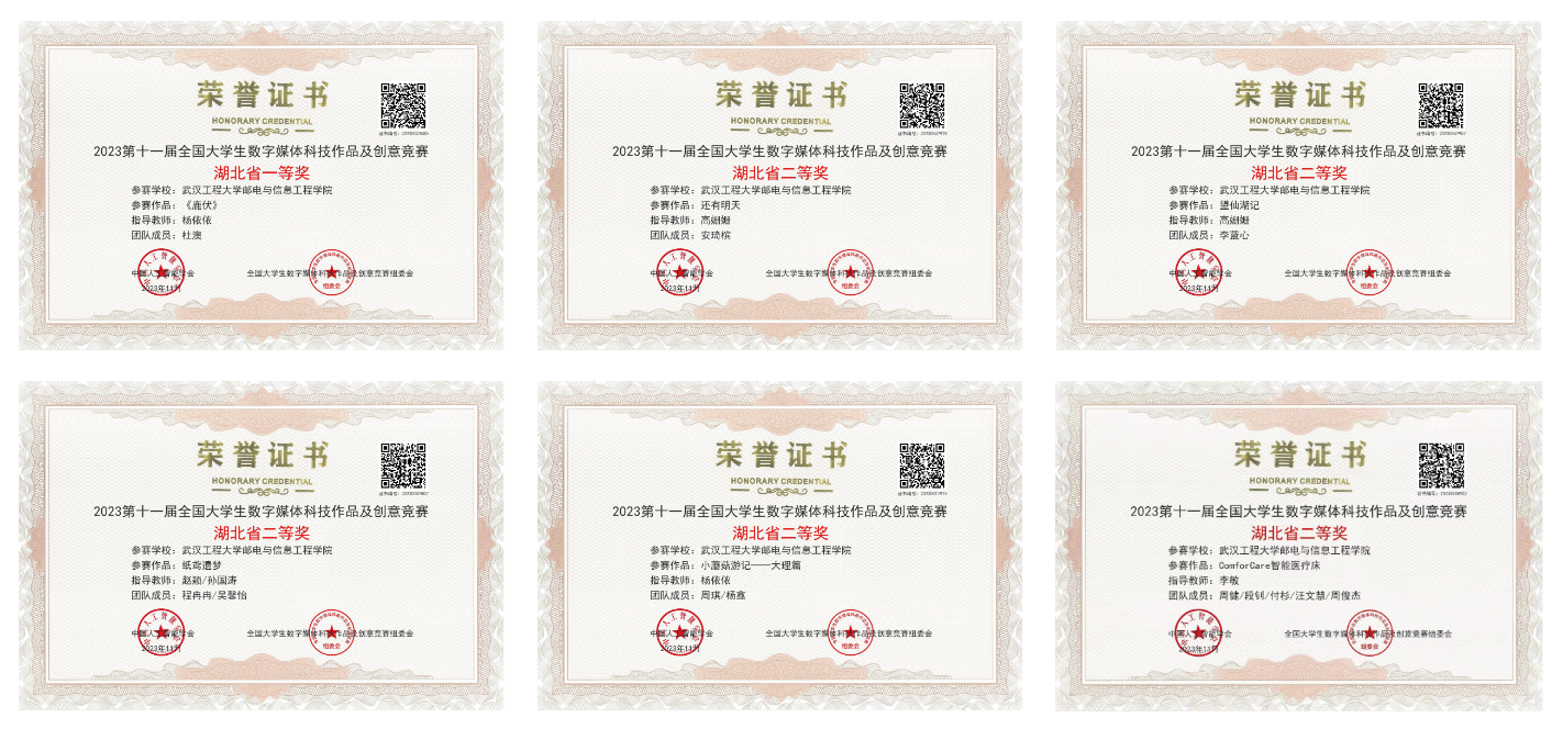 (通讯员:金雨轩)2023年11月,第十一届全国大学生数字媒体科技作品竞赛公布了省赛/分赛区获奖作品名单。经过我院师生不懈努力,共获得湖北赛区一等奖1项,二等奖7项,三等奖9项。![]()