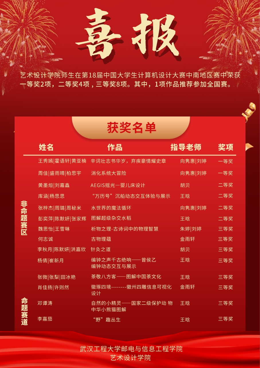 (通讯员:刘婷)近日,2025年(第18届)中国大学生计算机设计大赛中南地区赛结果揭晓,yL23411永利师生凭借扎实的专业功底和创新能力脱颖而出,最终取得优异成绩,在多个赛道中斩获佳绩,共荣获一等奖2项、二等奖4项、三等奖8项。 ![]() 此次获奖作品涵盖信息可视化设计、微课与AI辅助教学、数媒游戏与交互设计等多个领域,体现了学院师生在艺术设计领域的创新与实践能力。 在微课与AI辅助教学赛道中,王秀嫣等同学的作品《辛词壮志书华岁,弃疾豪情耀史章》凭借独特的创意与两次参赛的经验思考荣获一等奖并推荐至全国赛,由向隽惠老师、刘婷老师担任指导。周佳等同学的《消化系统大冒险》获得一等奖,张梓杰等同学的《水世界的魔法循环》获得二等奖,充分体现了学院师生跨学科创新实践能力。 ![]() ![]() 《辛词壮志书华岁,弃疾豪情耀史章》