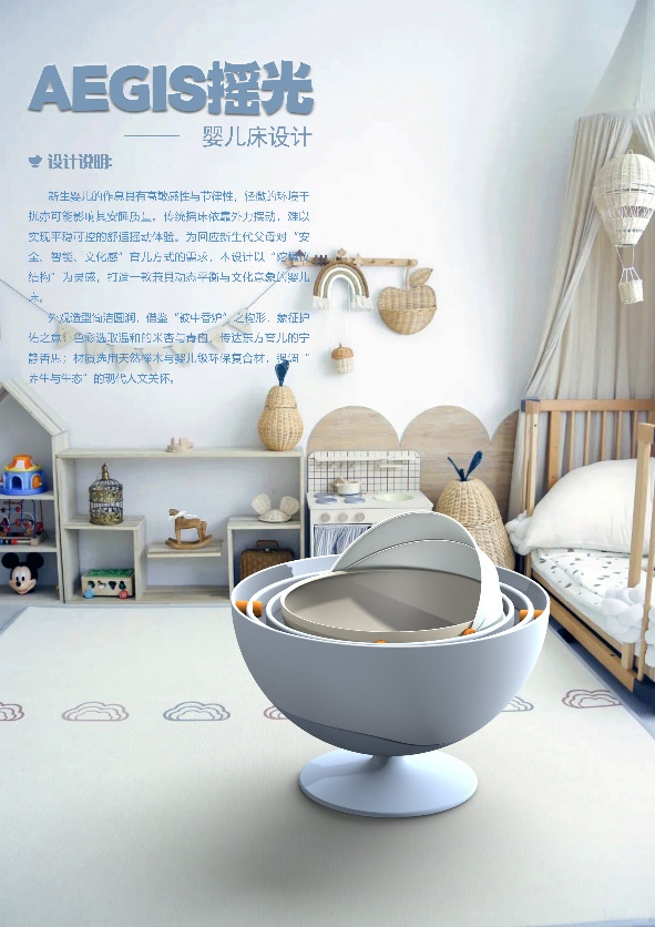在数媒静态设计赛道中,黄墨烜与刘嘉鑫同学的作品《AEGIS摇光—婴儿床设计》荣获二等奖,由胡贝老师指导。该作品为回应新生代父母对“安全、智能、文化感”育儿方式的需求,彰显了艺术设计的社会价值。