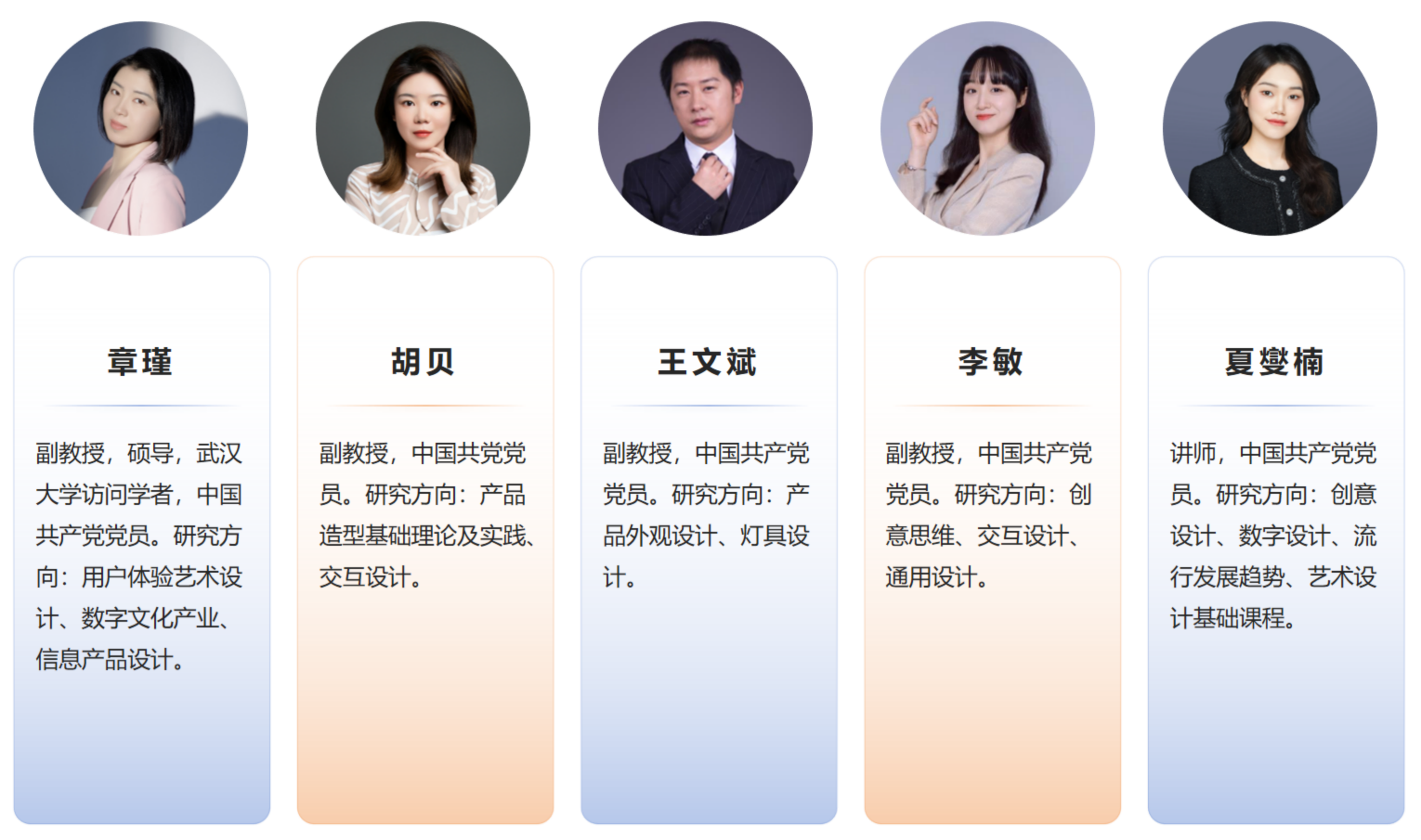 产品设计专业现有专职专任教师5人,4人副教授,1人讲师。全员具有研究生及以上学历,青年教师1名有QS专业排名前10设计院校海外留学背景。双师型教师2名,其中具有教育部骨干教师一流设计院校访学经历,硕士生导师,并选入国家艺术基金艺术人才培养资助“中华传统节日文化视觉创作与传播”项目,教学团队组建了学校大学生创新创业导师团队。教师知识结构具有多元化,在教师中有1名教师具有有工科背景、教师均具有实际设计项目经验。