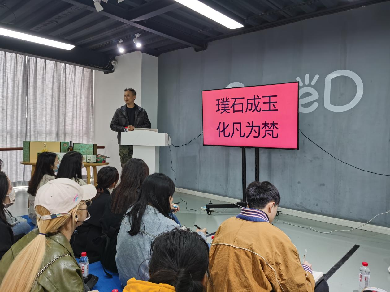 产品等形式, 述说中国的文化故事,是一家致力于创造具有中国特色文化IP和国际一流水准的创意机构, 覆盖品牌设计、社会化营销推广、IP孵化设计、包装设计、展陈设计、文创衍生品、文化礼品定制等多 元内容的文化与科技融合的创意机构,致力于跨产业矩阵搭建和商业变现,旨在助力品牌可视化+创新化 发展。公司负责人程子昂先生带领同学们了解了该公司的发展历程以及主要获奖经历,对公司工作环境和 工作分工进行介绍。 ![]()